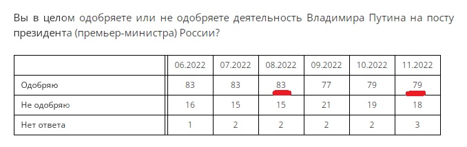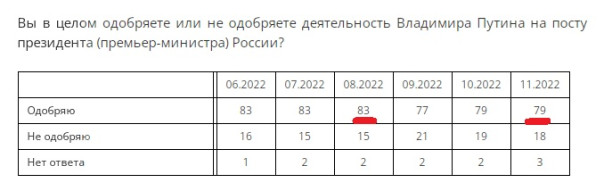 Снижение доли одобряющих работу президента на 4 п.п. за 3 месяца. Причем за ноябрь вообще не снизилось ("Народ не Простит Сдачи РусскАгА Херсона!"). И опять-таки: реально на негатив перешли лишь те же 3%.