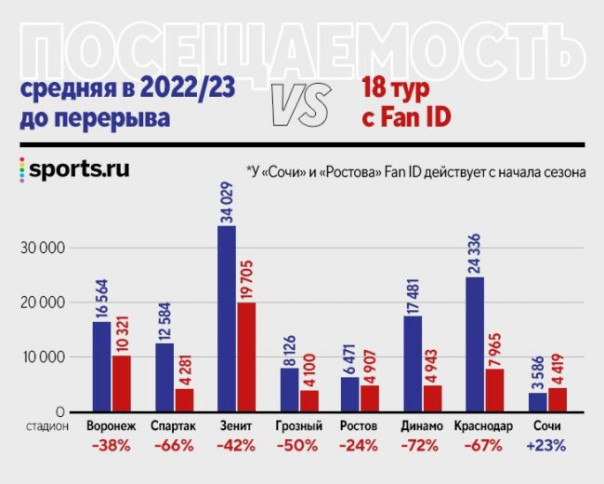 А теперь посмотрите, что стало с посещаемостью футбольных матчей после введения Fan ID. Горестные итоги только что завершившегося 18 тура чемпионата России (иллюстрация — Sports.ru)
