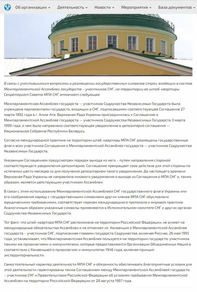 «Соглашением предусмотрен порядок выхода из него – путем направления стороной соответствующего уведомления депозитарию. Соглашение прекращает свое действие для этой стороны по истечении шести месяцев со дня получения депозитарием такого уведомления. До настоящего времени Верховная Рада Украины не направляла никакого уведомления о выходе из Соглашения о MПA СНГ и, таким образом, является действующим участником Ассамблеи».