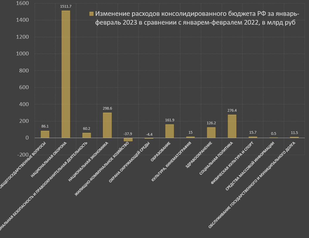За январь-февраль 2022 оборонные расходы были лишь на пятом месте по объему распределенных средств, занимая долю 8.5% в общих расходах, а в 2023 оборонные расходы на втором месте сразу после социальной политики, занимая долю 23.3%!