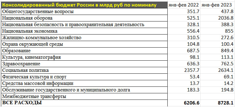В рамках консолидированного бюджета России за январь-февраль 2023 совокупные расходы составили 8.7 трлн без учета межбюджетных трансфертов, сальдо по которым образует ноль. Рост расходов по отношению к январь-февралю 2022 составил 41% или 2.5 трлн руб.