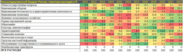 Несмотря на СВО, расходы на национальную оборону даже не показали свой максимум – 10.1% от всех расходов бюджета в 2022 по сравнению с максимумом в 12.1% в 2016 году, хотя выше средней доли расходов в 8.8% за последние 10 лет.