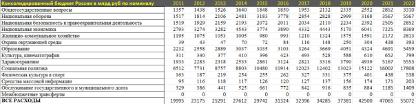 Диспозиция интересная. Совокупные расходы консолидированного бюджета в 2022 составили 55.1 трлн руб (треть от ВВП России), что на 17% или на 8 трлн выше 2021. В абсолютном сравнении – это рекордный рост расходов за все время, а в относительном – максимальные темпы, как минимум с 2011 года.