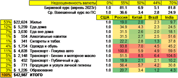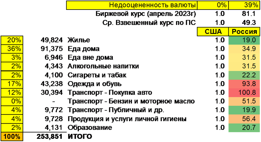 Возвращаясь к реальной стоимости валют по ППС, как видно из Таблицы №1 две категории товаров, по которым Россия находится в очень слабом состоянии -- это автомобили и одежда-обувь. По этим двум категориям стоимость рубля не только не недооценена, но и переоценена примерно на 16-24% (на момент анализа, то есть на апрель 2023 года).