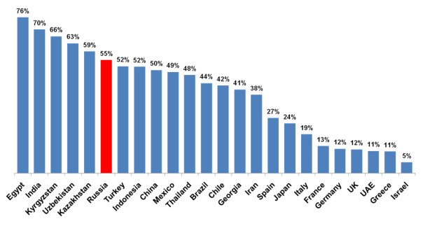 В качестве подтверждения того, что Рубль (как и многие другие валюты, такие как Египетский фунт, Индийская рупия, Казахский тенге, и Китайский юань) недооценены на 50%, а то и на 80% приведу недавнее сравнение недооцененности валют разных стран на основе стоимости покупательской корзины по базе данных Numbeo.