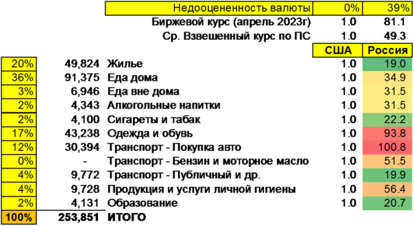 В результате пере-взвешивания курса по ППС получается, что с точки зрения Россиянина, по его структуре расходов, курс Рубля к Доллару США получается на уровне 49 руб/дол (а не 36,6 руб / дол как в Таблице №1). Это означает, что Рубль недооценен "всего лишь только" на 39% по состоянию на апрель 2023 года и на 49% по состоянию на сегодня.