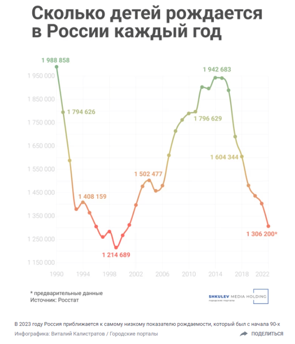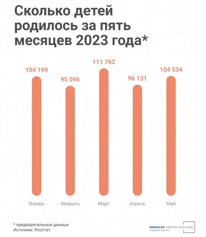 Сейчас же мы стремительно приближаемся к уровню той самой демографической ямы. Меньше всего новорожденных в истории современной России было в 1999 году — 1,2 млн. По итогам 2022 года мы к этому показателю приблизились максимально — 1,3 млн новорожденных. Согласно данным Росстата, за пять месяцев 2023 года в России родилось 511 тысяч детей, то есть в среднем чуть больше ста тысяч в месяц. Это еще больше приближает страну к антирекорду 1999 года.