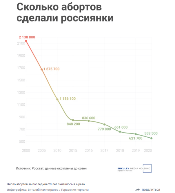 Сейчас на сайте Росстата можно найти Демографический ежегодник, опубликованный в 2021 году — в нем подробные данные за годы с 2015 по 2020-й, до этого информация публиковалась раз в пять лет. Судя по этой статистике, число абортов уверенно снижается уже 20 лет, и теперь россиянки их делают в четыре раза меньше. В 2020 году было зарегистрировано 553,5 тысячи абортов, а в 2000 году — более 2 млн. Это при том, что родились в 2000 году 1,27 млн детей.