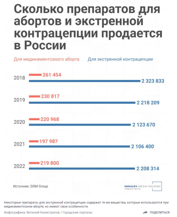 Доля медикаментозных абортов еще меньше. Согласно данным маркетингового агентства DSM Group, специализирующегося на исследованиях фармацевтического рынка, в том же 2020 году было продано 220 968 упаковок препаратов для искусственного прерывания беременности. Доля препаратов экстренной контрацепции намного больше — ежегодно их продают более двух миллионов упаковок.
