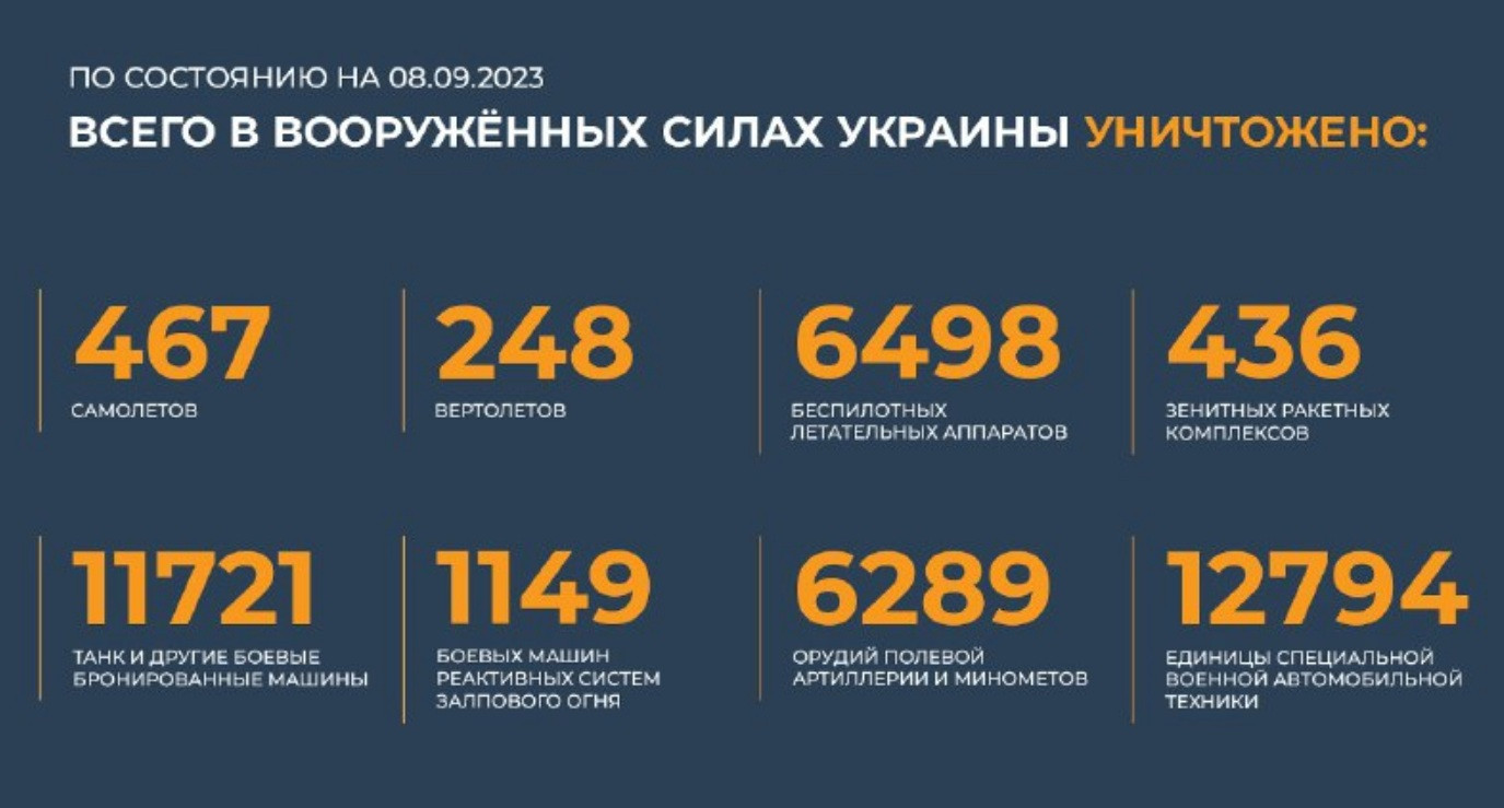 Брифинг И.Конашенкова от 8.09.2023 года по данным официального источника -Министерстваобороны Российской Федерации.