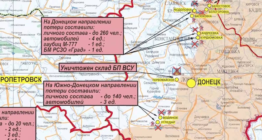На Южно-Донецком направлении активными действиями подразделений группировки войск «Восток», ударами штурмовой и армейской авиации, огнем артиллерии нанесено поражение живой силе и технике 79-й десантно-штурмовой, 72-й механизированной и 58-й мотопехотной бригад ВСУ в районах населенных пунктов Сладкое, Угледар, Новодонецкое Донецкой Народной Республики и Малиновка Запорожской области.
