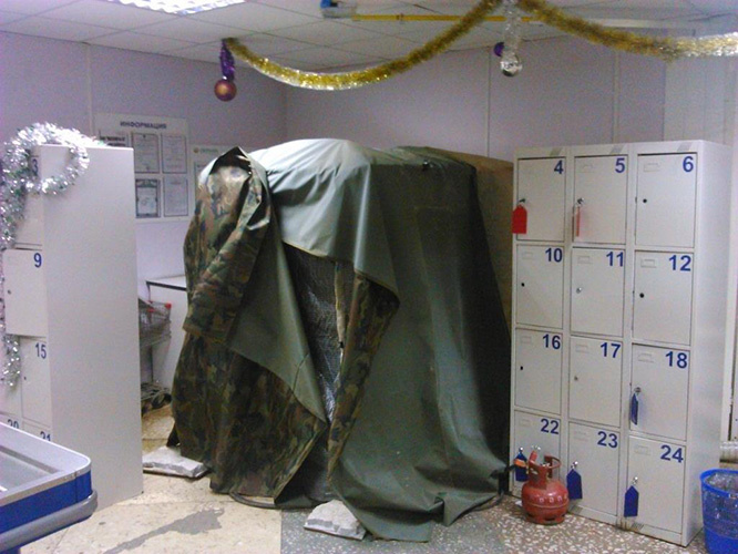 «Открыв дверь, преступники соорудили вокруг банкомата заранее подготовленный каркас, на который натянули армированную полиэтиленовую пленку, сверху — защитный плотный материал. Края плотно придавили обломками от бетонных плит из вскрытого пола.