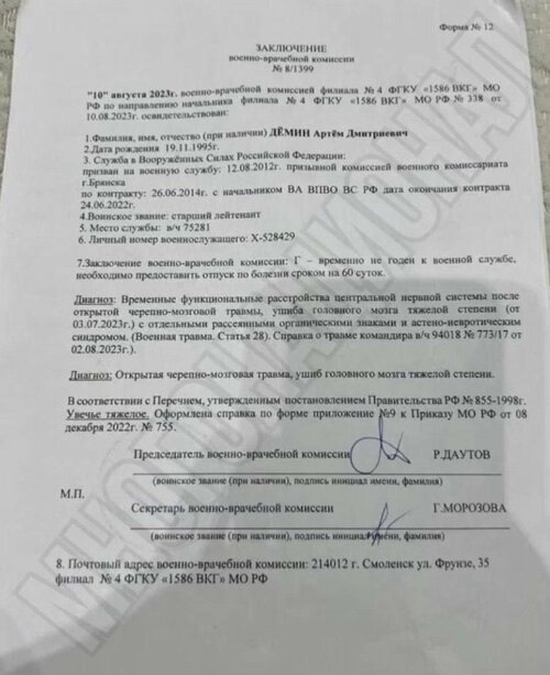 Кроме того согласно заключению ВВК (военно-врачебная комиссия), у Демина выявлены временные функциональные расстройства ЦНС после открытой черепно-мозговой травмы, а также ушиб головного мозга тяжелой степени. Согласно решению комиссии, мужчину признали временно негодным к военной службе и заявили о необходимости назначить отпуск по болезни сроком на 60 суток.
