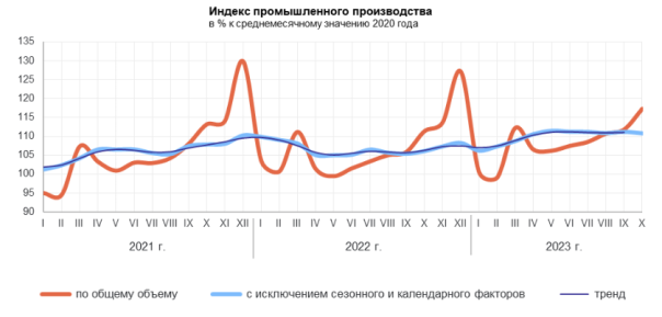 В октябре 2023 года объемы промышленного производства увеличились по сравнению с аналогичным периодом 2022 года на (+)5,3%. По сравнению с сентябрем 2023 года зафиксирован рост на (+)4,9%. В целом за десять месяцев 2023 года индекс промышленного производства вырос по сравнению с январем-октябрем 2022 года на (+)3,5%.