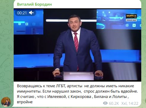 Возвращаясь к теме ЛГБТ*, артисты не должны иметь никакие иммунитеты. Если нарушил закон, спрос должен быть вдвойне, - написал Бородин в телеграм-канале. - Я считаю, что с Ивлеевой, с Киркорова, Билана и Лолиты - втройне.