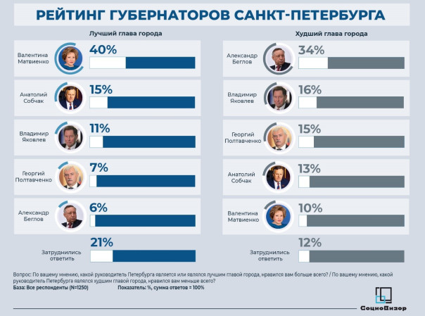 Центр социологических исследований "СоциоВизор" провел свежий мониторинг рейтинга губернаторов Петербурга. Как выяснилось, худшим из них снова оказался петербургский градоначальник Александр Беглов. Уровень его поддержки опустился до 6% среди горожан. Примечательно, что этот показатель оказался ниже, чем у его предшественника Георгия Полтавченко, которого традиционно считали самым худших губернатором в новейшей истории Петербурга.