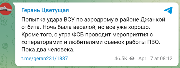 Сообщается о ракетном ударе противника этой ночью по аэродрому Джанкой в Крыму