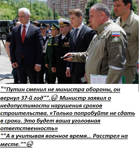 Министр заявил о недопустимости нарушения сроков строительства. «Только попробуйте не сдать в сроки. Это будет ваша уголовная ответственность», — сказал он (видео опубликовано в Telegram-канале Минобороны РФ).