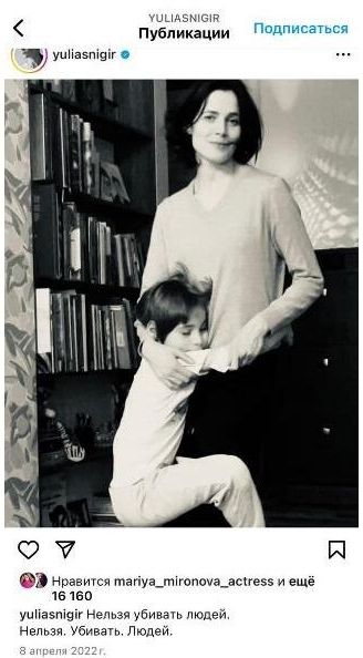 Впрочем, иногда Юлия всё-таки не выдерживала и давала выход своим эмоциям и подлинным мыслям. Так, уже после объявленной в сентябре 2022 года частичной мобилизации актриса даже опубликовала в Сети видео, как она с криками пытается выгнать из подъезда своего дома сотрудников военкомата. Довольно быстро Снигирь этот ролик удалила, а обеспокоенные её судьбой подписчики волновались зря - после этого актриса продолжила жить и работать в России.
