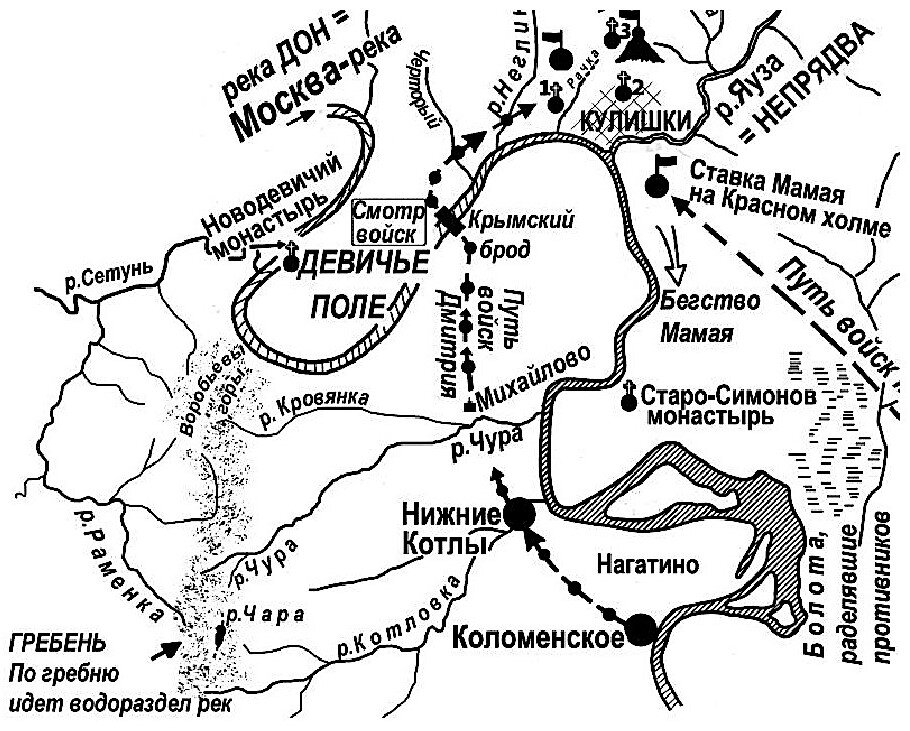 Именно этот маневр стал первой неожиданностью для Мамая, который ожидал, что русские полки займут оборону на рубежи реки Оки. Второй неожиданностью для хана стал безусловный талант военачальника, которым обладал князь Дмитрий. Перед битвой он так расположил свои полки, что с флангов защиту им обеспечивали густые леса.