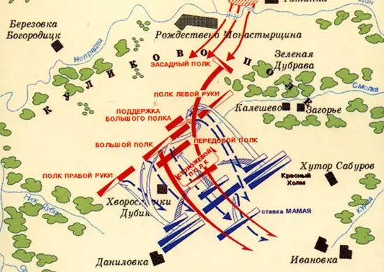 В центре, как это было принято у русских войск, расположился Большой полк, а за ним – резерв, который должен был вступить в бой в случае прорыва ордынской конницы. Кроме того, в урочище «Зеленая Дубрава», которое находилось в зоне ответственности полка Левой руки, был расположен Засадный полк, которому суждено было сыграть решающую роль в сражении.