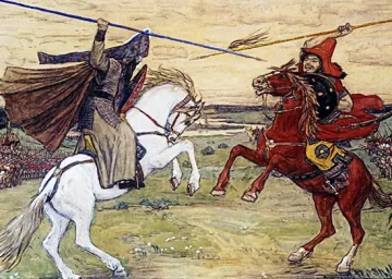21 (8) сентября началось сражение. Ему предшествовал поединок русского богатыря монаха Александра Пересвета с монгольским батыром Челубеем. Оба воина насмерть поразили друг друга копьями. После этого славившиеся конным напуском татары бросили в бой свою кавалерию. Она смогла смять боевые порядки передового полка и вступила в битву с Большим полком.