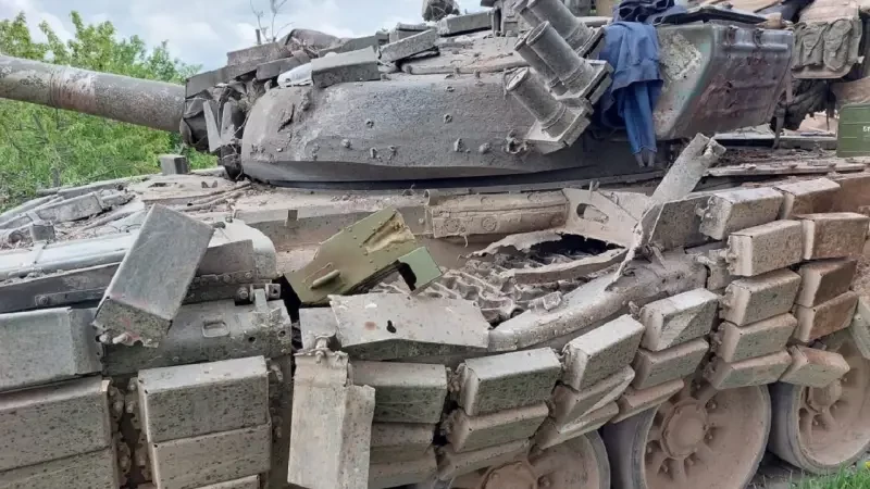 Ещё Т-80Б, но уже после попадания 125-мм кумулятивного снаряда 3БК14М в верхнюю лобовую деталь, прикрытую динамической защитой. Броня, как и в прошлые разы, не пробита. Взамен больше чем наполовину «ослеплён» механик-водитель — левое стекло его прибора наблюдения разрушено на 70 %, а центральное — на 50 %. Кроме того, разрушен ИК-прожектор «Луна» на башне, и пробита антенна комплекса управляемого вооружения, что привело его в негодность.