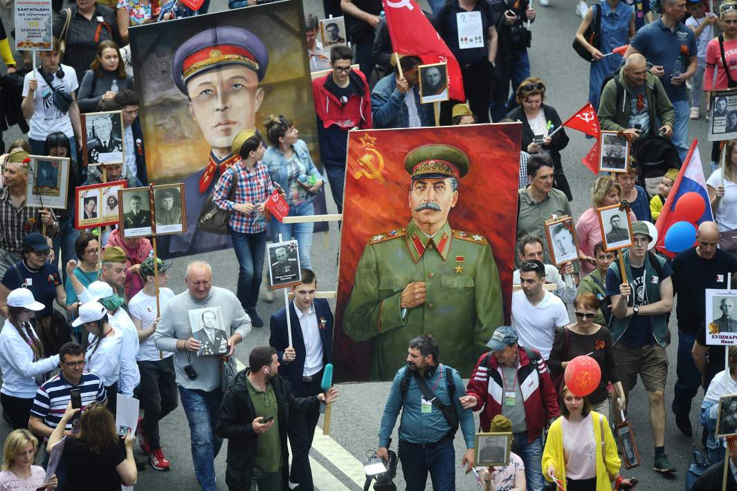 Участники акции «Бессмертный полк» в Москве несут портреты Иосифа Сталина и генерала Дмитрия Карбышева