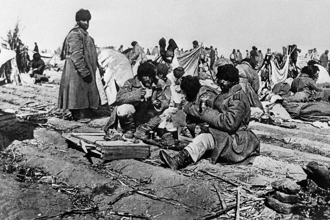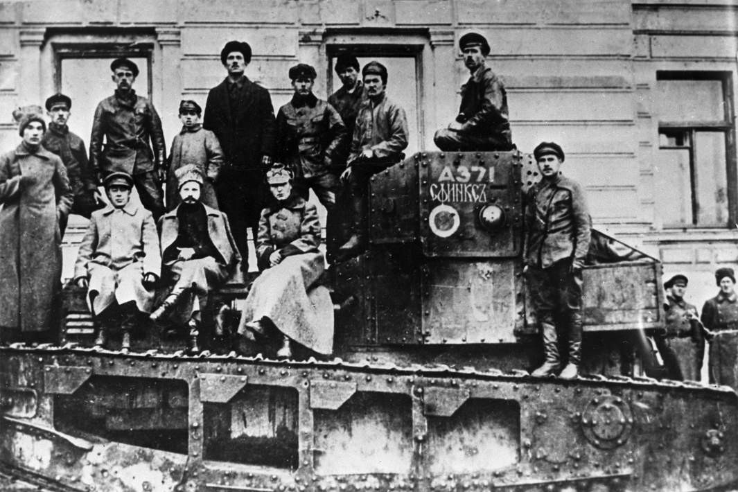 Гражданская война. Трофейный танк МК-А «Сфинкс» из состава 2-го танкового отряда Русской армии на станции Снигиревка. На танке сидят (слева направо): Сергей Гусев, член РВС Южного фронта, Михаил Фрунзе, командующий Южным фронтом, и Дмитрий Карбышев, заместитель начальника инженеров Южного фронта