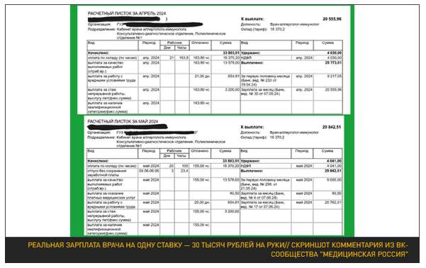 Чтобы не быть голословными, медики показывают расчётные листки. Врач аллерголог-иммунолог в одном из регионов получала на руки в апреле и мае прошлого года чуть менее 30 тысяч рублей в месяц (это одна ставка), а потом просто уволилась. Прочитав о средней зарплате в 123 тысячи, врач сильно удивилась.