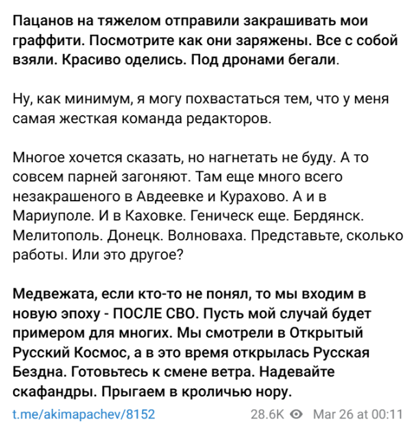 Аким пишет: «Кстати, я ещё в Каховке, Авдеевке, Курахово, Мариуполе много хуев нарисовал укропам. Но резонанс только сейчас. Новороссия недостаточно русская получается и там можно, а вот в Курской области нельзя?»