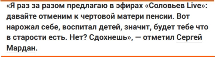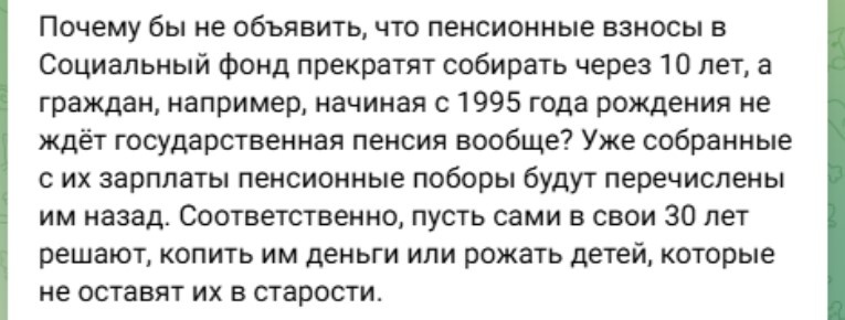 Так вот, 23 мая он заявил, что людям, которым сейчас около 30 лет или меньше, нужно отменить будущие пенсии по старости. По его мнению, это будет стимулировать их рожать детей, которые и будут обеспечивать их в преклонном возрасте. Об этом он написал в своём Телеграм-канале.