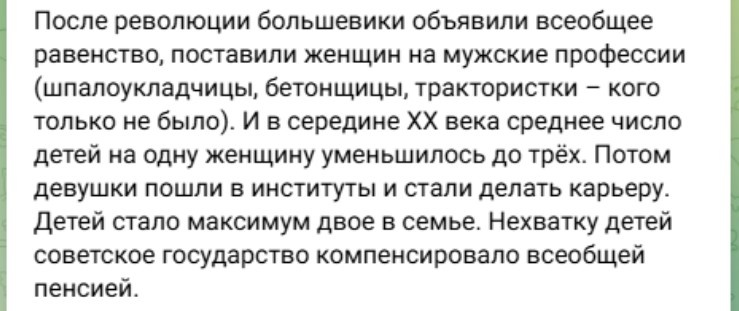 Теперь по поводу "плохих" большевиков и Советской власти, при которой, как рассказывает Малофеев,, упала рождаемость из-за того, что женщины получили равные права с мужчинами.