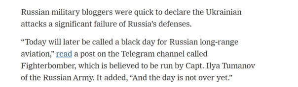 "Этот день позже будет назван чёрным днём русской стратегической авиации", гласит пост на канале Fighterbumboy, предположительно ведущимся капитаном русской армии Ильёй, "и день ещё не закончен"".