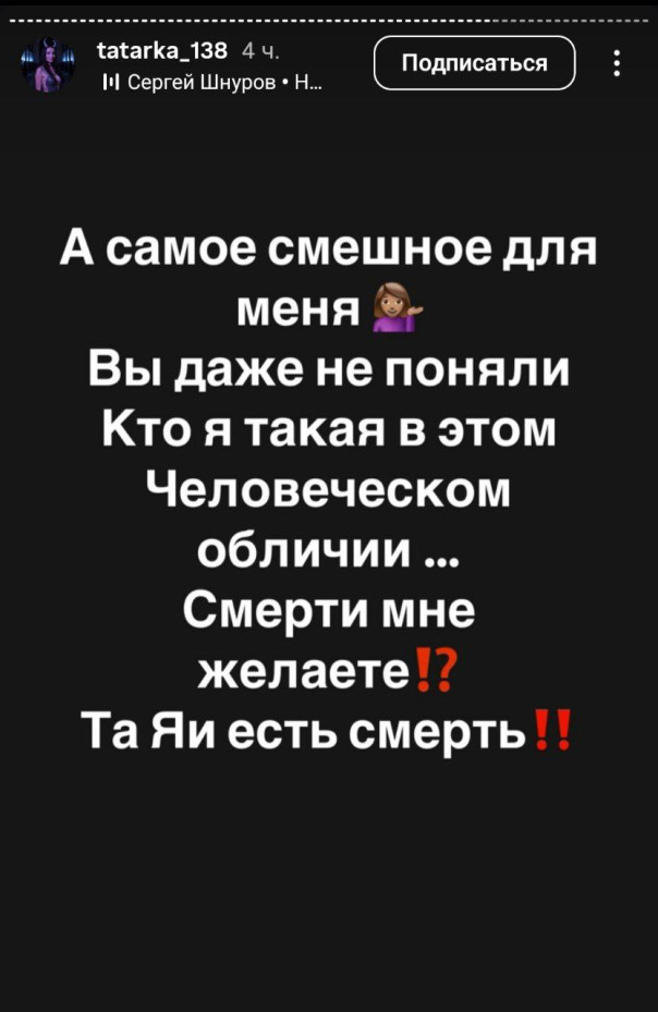 Теперь наводит порчу, пытается вызвать жалость и грозит самоубийством. Источник