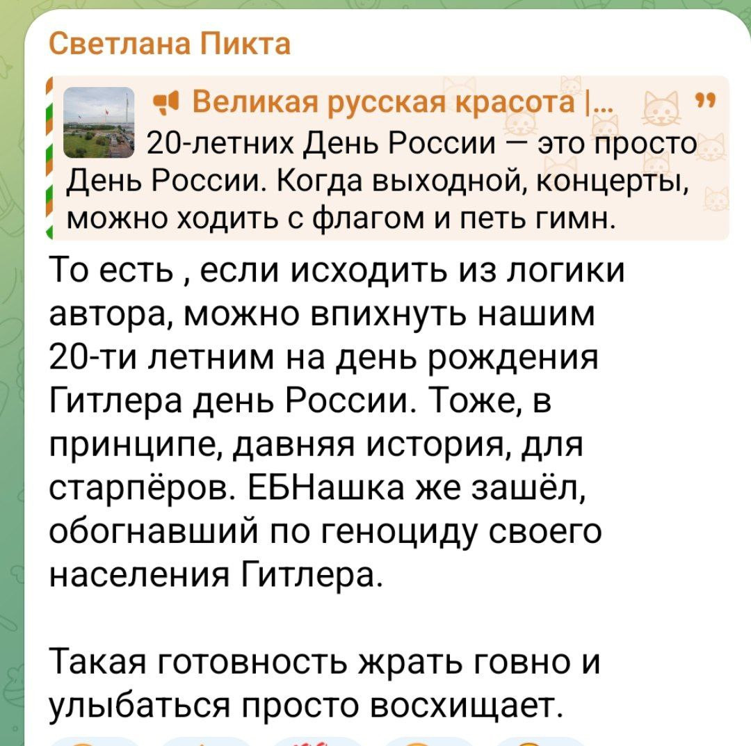 Точно так же шайка Монтян утверждает, что День России — это не праздник, а повод для стыда! Мой ответ на это такой: Да, ликвидация Советского Союза (именно ликвидация, а не просто «развал») — это тяжёлый и горький период в истории нашей страны! Вспоминать те события до сих пор больно и горько!