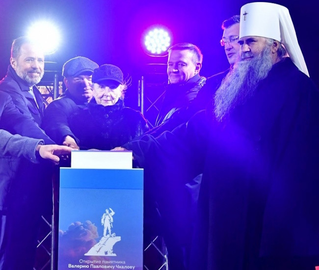 На фото: дочь Героя СССР летчика Валерия Чкалова Ольга Чкалова, министр транспорта Российской Федерации Роман Старовойт (третий справа) и губернатор Нижегородской области Глеб Никитин (второй справа) на церемонии открытия памятника Валерию Чкалову на Ходынском поле в Москве, 2024 год
