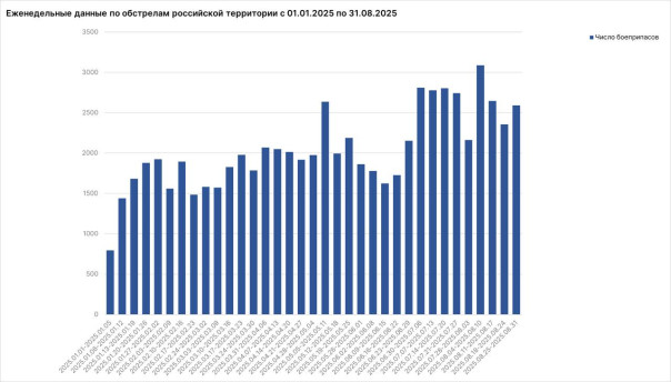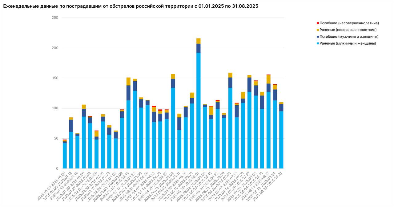 За неделю с 25 по 31 августа от обстрелов украинских нацистов пострадали 110 мирных жителей: ранены 98 человек, в том числе 3 несовершеннолетних, погибли 12 человек. Всего по гражданским объектам на российской территории украинские вооруженные формирования выпустили не менее 2592 боеприпасов.