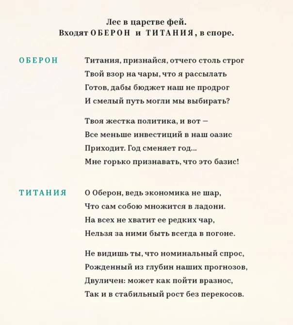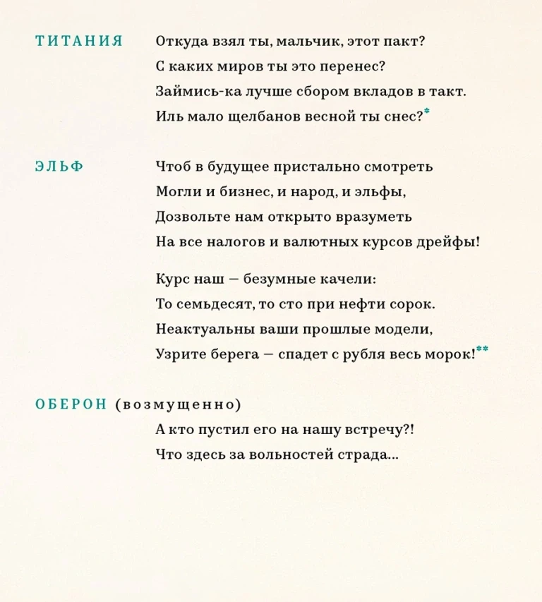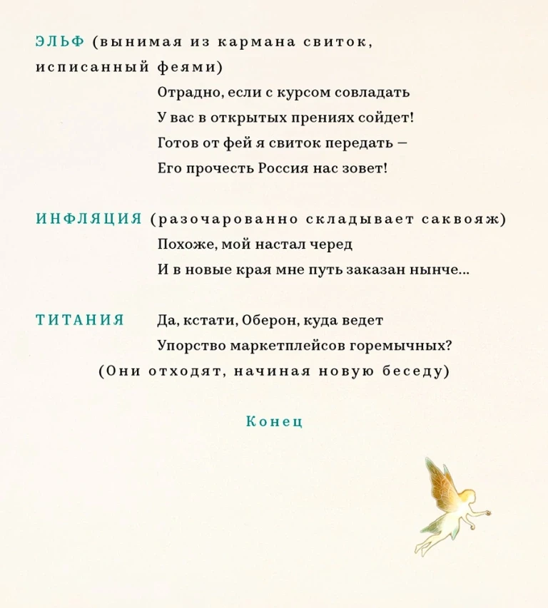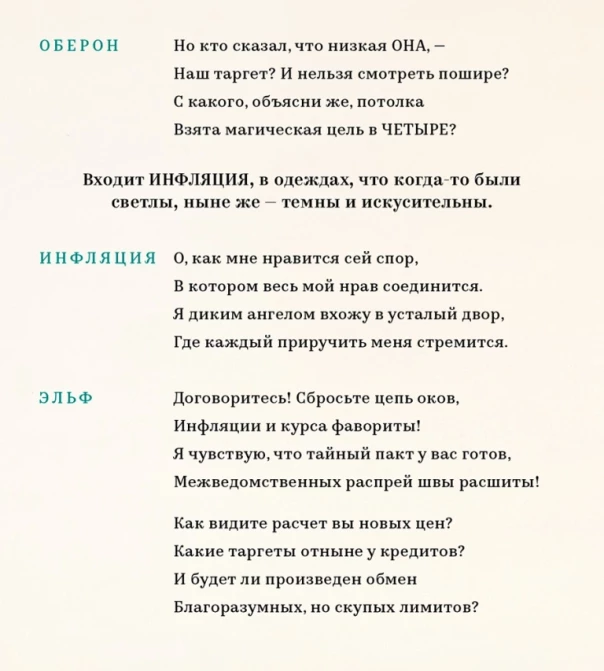 Среди реплик Инфляции в пьесе есть такая: «О, как мне нравится сей спор, в котором весь мой нрав соединится / Я диким ангелом хожу в усталый двор, где каждый приручить меня стремится». Пьянов объяснил, что в этом четверостишии авторы пытались подчеркнуть, что инфляция питается «раздором».