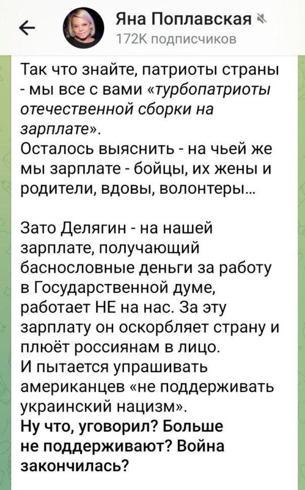 - Вот как патриоты становятся презренными «турбопатриотами». Таким образом Делягин плюёт в лицо и в душу всем, кто все четыре года беззаветно верил в цели спецоперации, кто, умываясь кровью и потом, бил врага, освобождая Донбасс, Запорожскую, Херсонскую, Курскую области, кто похоронил сыновей, вернувшихся домой в гробах и черных пакетах, кто потерял боевых товарищей, кто лишился рук и ног, здоровья, которое уже не вернуть. А также тем, кто выбиваясь из сил, помогал фронту, кто передал за «ленточку» тысячи тонн грузов. Тем, кто внёс свою лепту, посильную и непосильную в приближение Победы. И вот теперь Делягин поставил на всех этих людях печать «ТУРБОПАТРИОТЫ». Пока были нужны, пока у власти в США был Байден, с которым не могли ничего «порешать», тогда это была «опора страны и армии». А вот когда появился шанс обтяпать вопросики с Трампом, сразу стали неудобны. Ну что вы лезете со своим мнением, засуньте его… поглубже.
