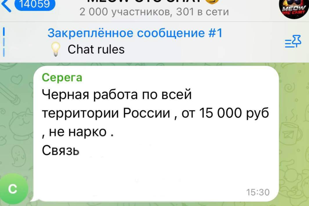 Основная аудитория — чаты для поиска наркокурьеров и экстремистские сообщества. В первых вербовщики распространяют незамысловатые объявления с предложением «черной работы» за 10–15 тыс. рублей. В тематических группах по заказу силовых услуг в даркнете чаще всего ищут исполнителей поджогов или другой порчи имущества за чуть большие суммы.