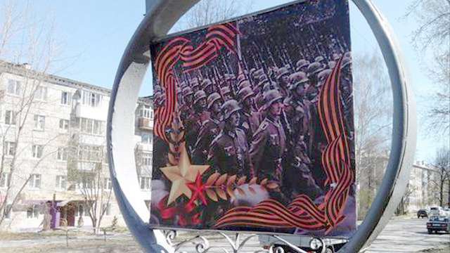 В Свердловской области на улицах Алапаевска ко дню Великой Победы появились плакаты марширующих гитлеровцев. На груди у немецких солдат видны знаки отличия, а на голове – вермахтовские каски. А сами плакаты обрамлены георгиевской ленточкой, сообщает агентство URA.Ru.