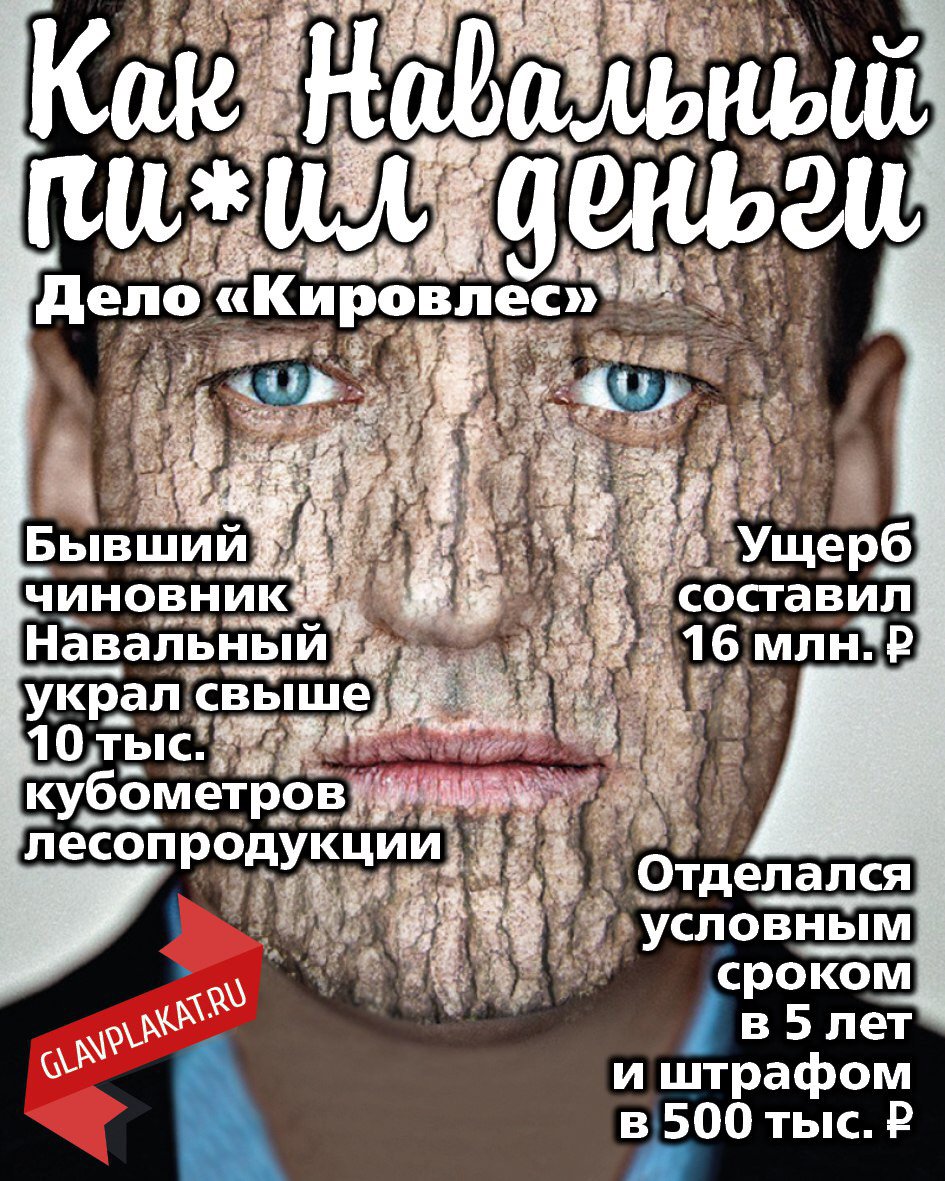 Ранее, на процессе о хищениях в "Кировлес", Алексей Навальный также отделался условным 5-летним сроком, и штрафом в полмиллиона рублей", - напомнили предысторию участники "Главплаката".