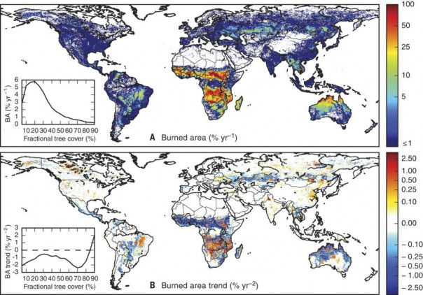 Вверху: процент площади той или иной части мира, выжигаемой пожарами за год. Заметно, что Россия страдает от них меньше многих. Внизу: изменения в частоте пожаров за 1998-2015 годы. Синим отмечено локальное падение частоты пожаров, желтым — рост. Легко видеть, что, несмотря на глобальное потепление, пожаров на планете становится меньше.