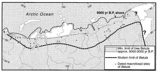 Серым показано самая консервативная оценка распространения березы 9-4 тысячи лет назад. Жирной пунктирной линией — современная граница ее северного распространения. Севернее этой границы сейчас тундра, но к концу XXI века снова возникнут леса.