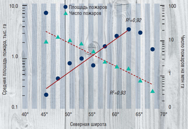 На графике легко видеть, что чем южнее, тем чаще пожары лиственничной тайги. Несмотря на это, площадь пожаров на юге меньше, чем на севере — в том числе и потому, что в более теплых краях в норме больше осадков. Вопреки более высокой частоте пожаров, южная тайга биопродуктивнее и разнообразнее видами, чем северная. Ждать от потепления снижения разнообразия животных в тайге не приходится / ©В. Харук.