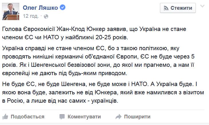 «Украина действитпельно не станет членом ЕС, потому что с такой политикой, которую проводят нынешние кормчие Обьединенной Европы, ЕС не будет через 5 лет. Как и Шенгенской безвизовой зоны, куда мы так стремимся, а нам ее европейцы не дают под любым предлогом», — пишет Ляшко.