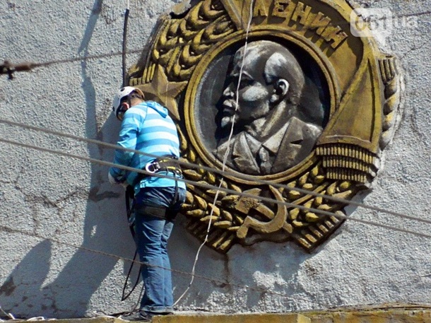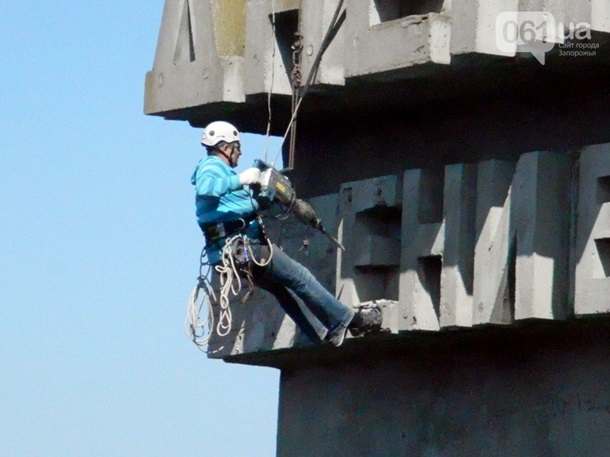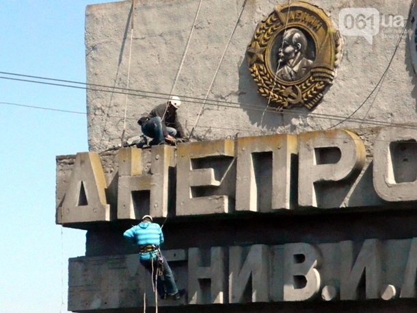 Над демонтажом вывески Днепрогэса с утра корпели два промышленных альпиниста. Первым делом демонтажники приступили к удалению с фасада плотины надписи "имени В.И. Ленина".