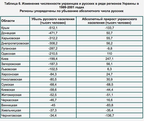 Спустя 75 лет на Украине прошла первая и последняя перепись за 25 лет независимости. Перепись определила: при общем сокращении численности населения по сравнению с 1989 годом на 3,25 миллиона человек, украинцев стало больше на 122,6 тысячи, а вот русских – на 3,02 миллиона меньше (!)