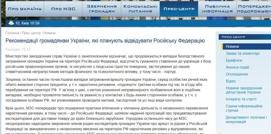 «В последнее время участились случаи задержания и ареста граждан Украины, среди личных вещей которых якобы обнаружены посторонние предметы, в том числе наркотические вещества», — отмечается в документе. По данным ведомства, правоохранительные органы России к украинцам относятся негуманно, применяют методы психического и физического воздействия, подвергают пыткам.